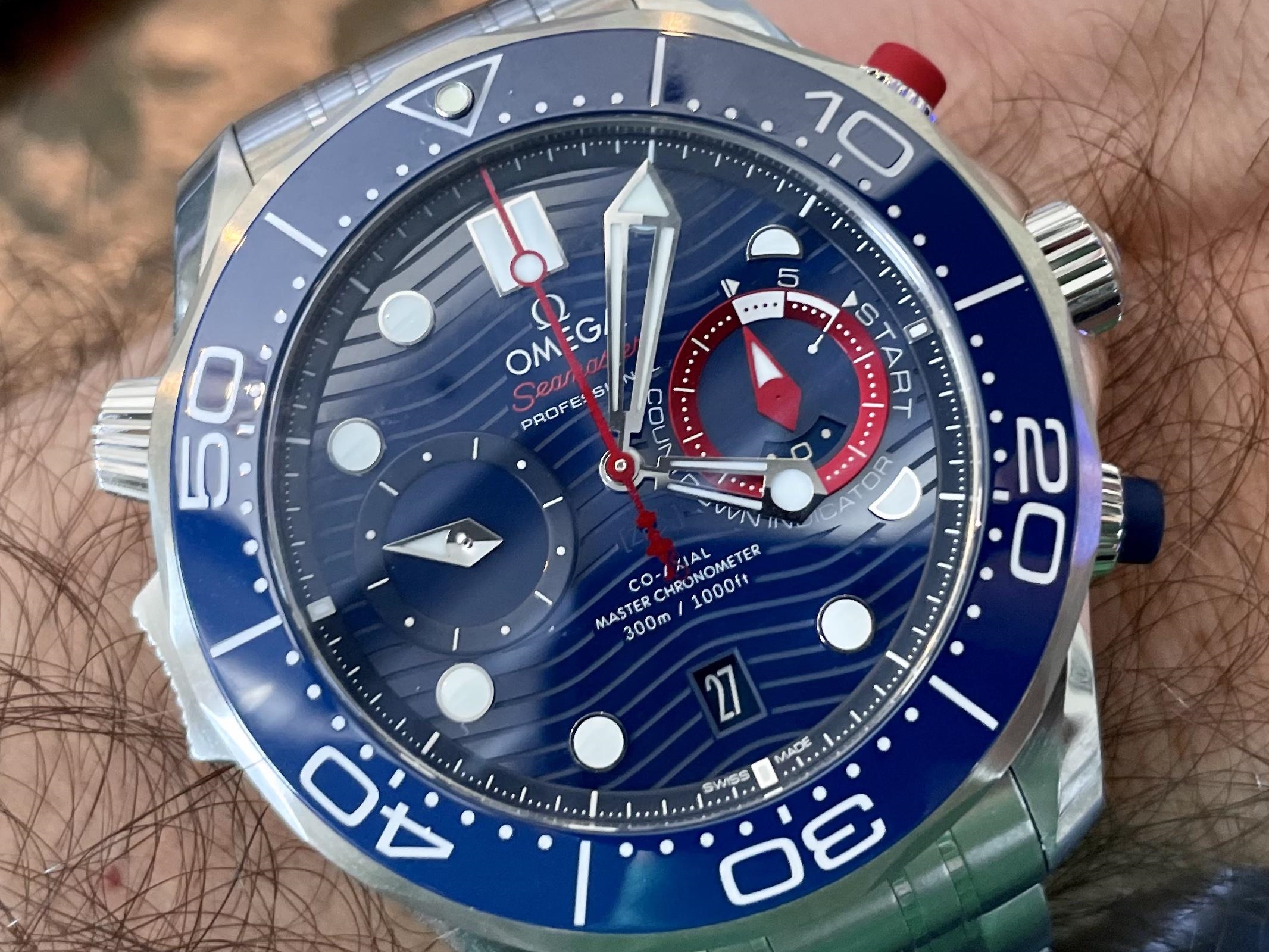 The 44 mm chronograph is built from stainless steel, with a bezel ring in blue ceramic and a white enamel diving scale. To improve grip during water activities, the watch provides blue and red soft-touch pushers in rubber.