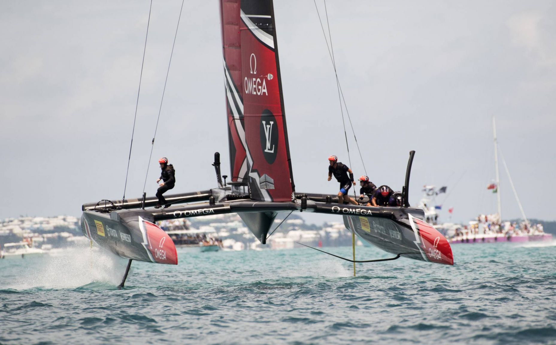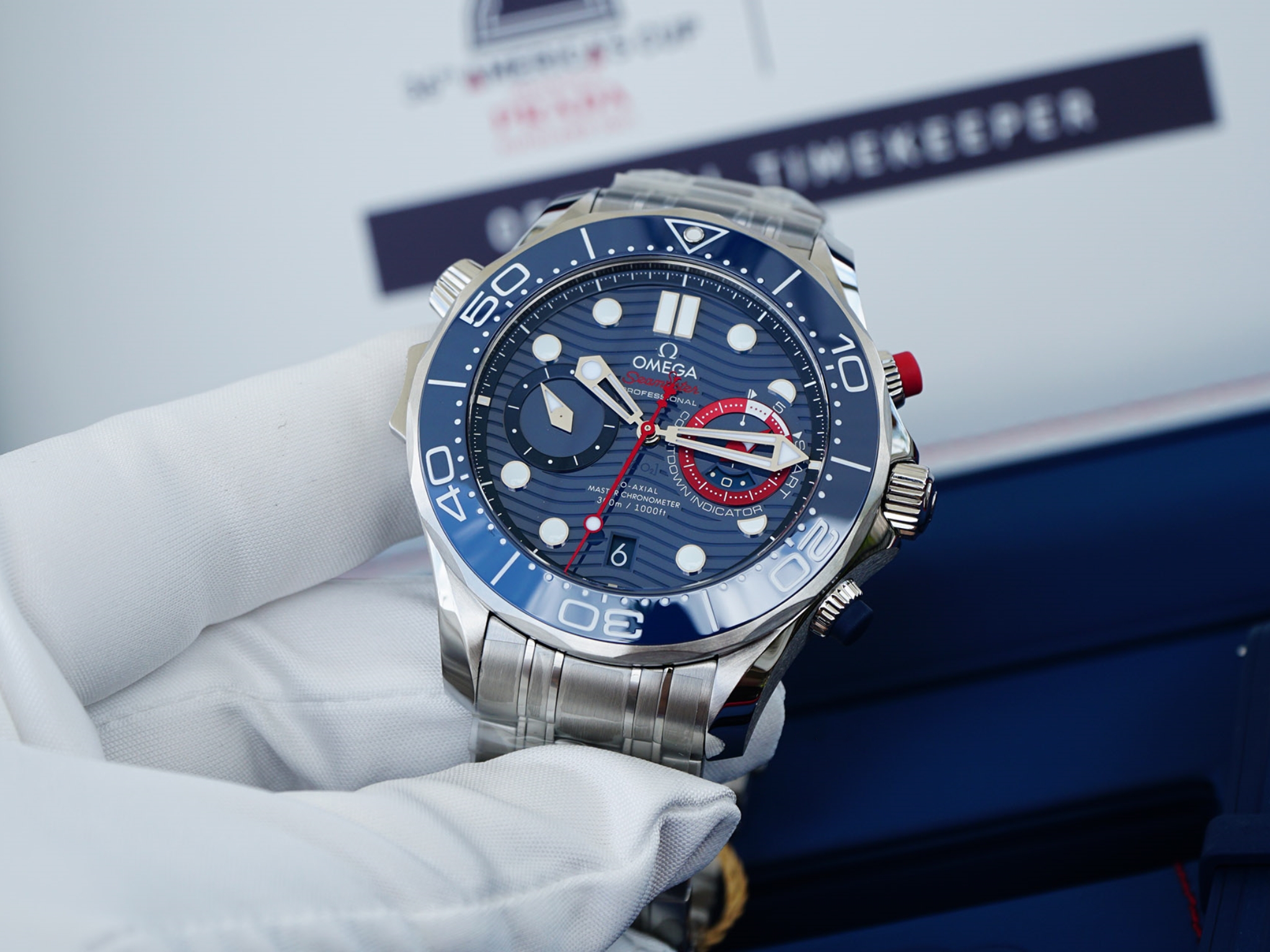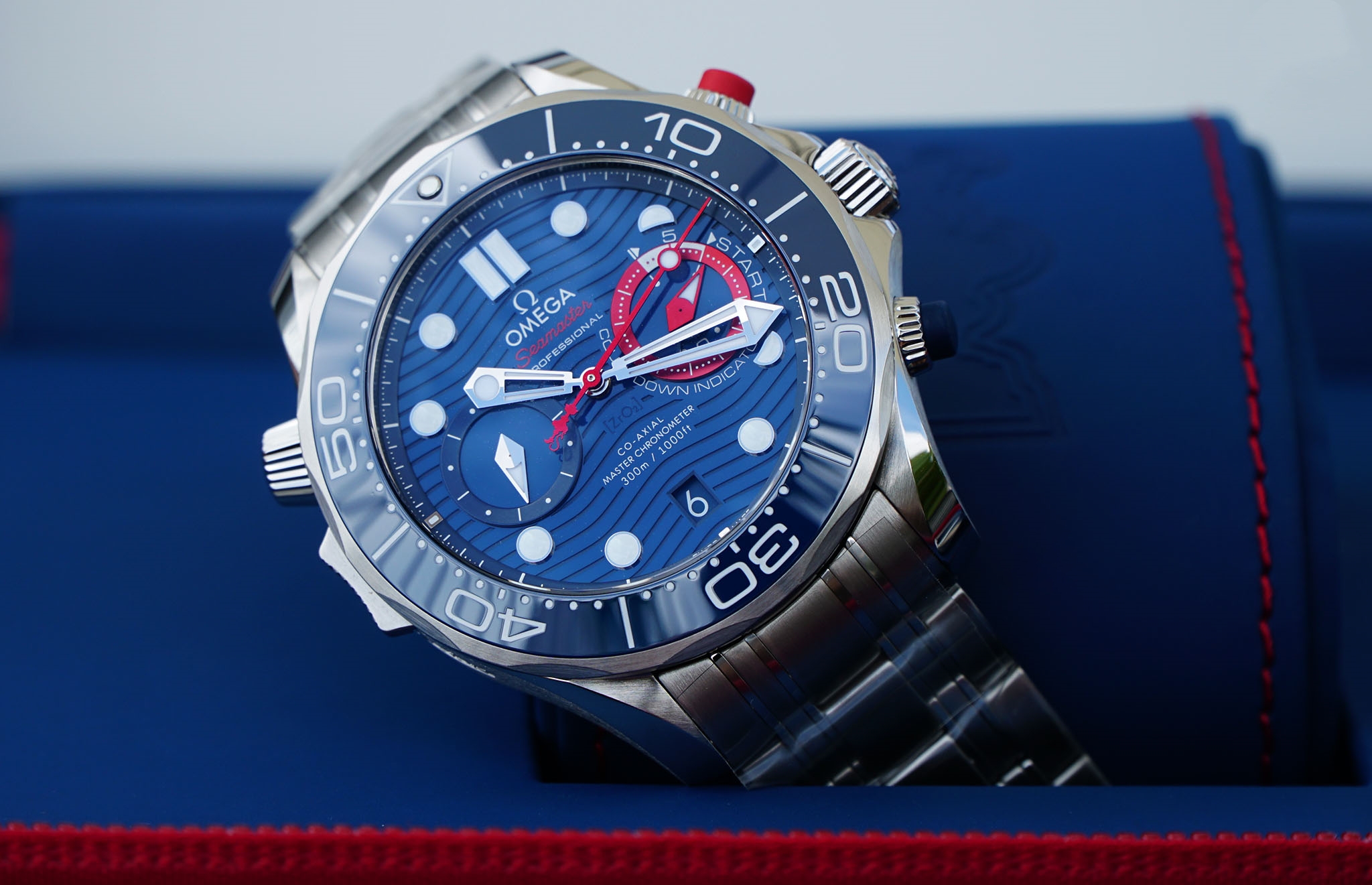 On the blue ceramic dial with its laser-engraved waves and a date window at 6H, OMEGA has included a regatta countdown indicator ring crafted in red anodized aluminium. The indicator features an hour disc underneath the subdial, designed to highlight the vital minute hand during sailing. The red anodized aluminium minute and rhodium-plated small seconds hand is inspired by the shape of a boat hull, while the central seconds chronograph hand, also in red anodized aluminium, carries an America’s Cup on the counterweight.