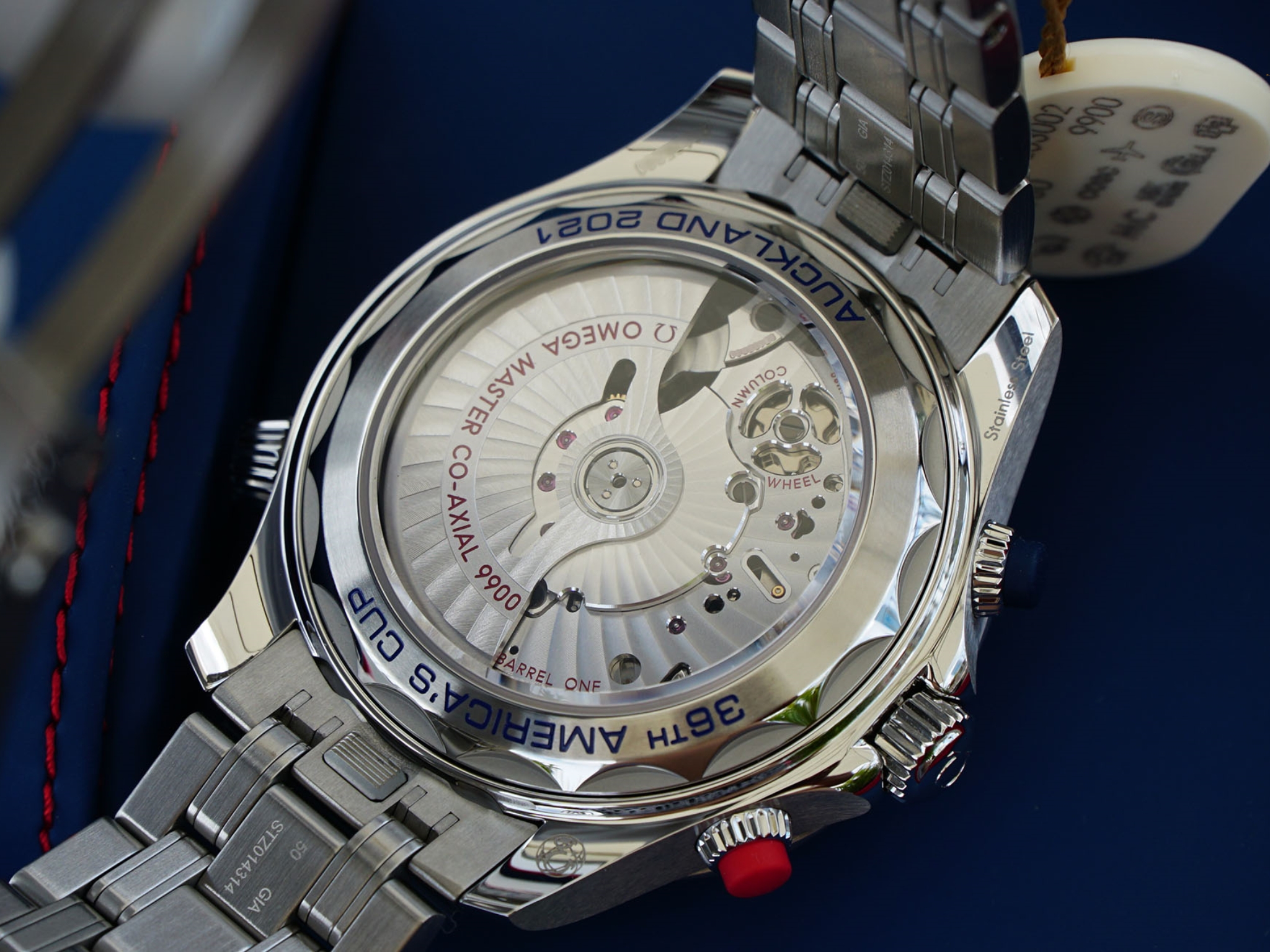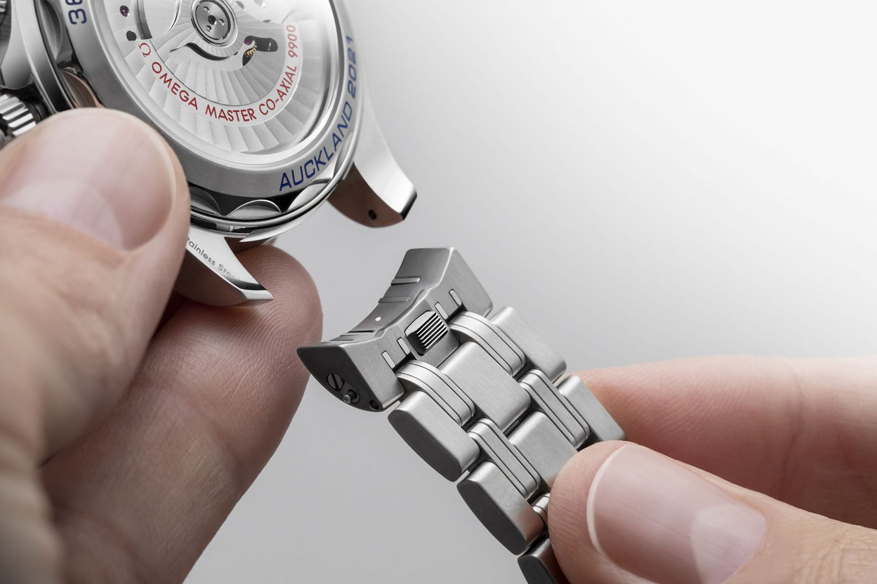 OMEGA’s exclusive CHRONO LOCK system is included to secure the chronograph functions when needed, adding secure timekeeping and the ability to lock your measured time. On the Alveol shaped caseback, the engravings are filled with blue lacquer and pay tribute to the “36th America’s Cup” and “Auckland 2021”.