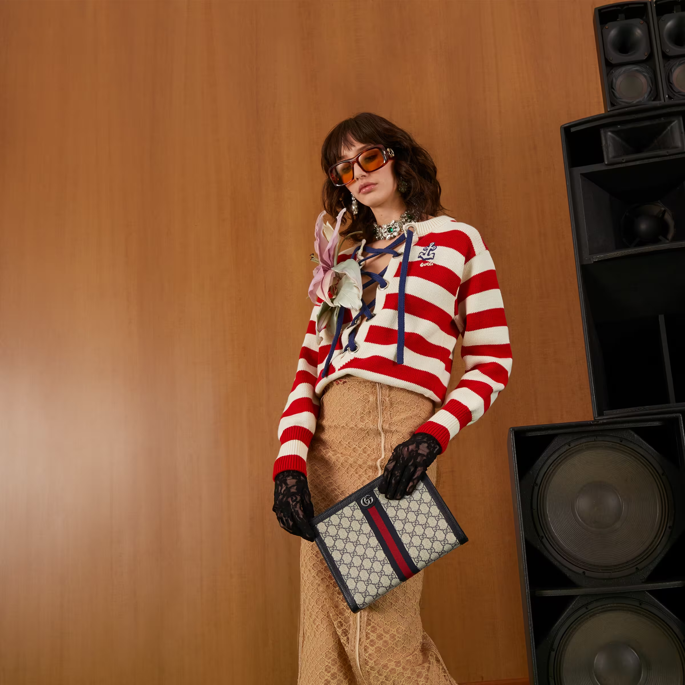 Mirroring the material's historic origins. GG Supreme is introduced in a timeless mix of blue and beige for Gucci Love Parade. The canvas has come to the front of each collection decade after decade to become a hallmark of the House. Here. the classic palette defines this slim Ophidia pouch.