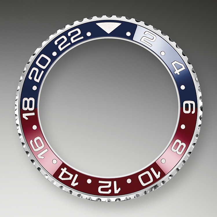 REFERENCE126719BLROMODEL CASEOyster, 40 mm, white goldBEZELBidirectional rotatable 24-hour graduated bezel. Two-color blue and red Cerachrom insert in ceramic, molded numerals and graduationsWATER-RESISTANCEWaterproof to 100 meters / 330 feetMOVEMENTPerpetual, mechanical, self-winding, GMT functionCALIBRE3285, ManufacturePOWER RESERVEApproximately 70 hoursBRACELETOyster, flat three-piece linksDIALMidnight blueCERTIFICATION
